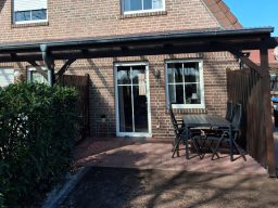 Die überdachte Terrasse des Ferienhauses moin Seeblick Heede lädt zum Entspannen, Frühstücken oder gemütlichen Beisammensein ein – bei jedem Wetter. Genieße die frische Luft und lass die Seele baumeln, während du den Blick in den hauseigenen Garten schweifen lässt.
