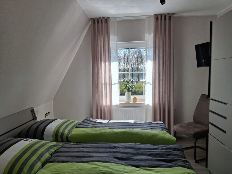 Das Elternschlafzimmer im Ferienhaus moin Seeblick Heede ist hell, ruhig und gemütlich eingerichtet. Das komfortable Doppelbett sorgt für erholsamen Schlaf, während du vom Zimmer aus einen direkten Blick auf den See genießen kannst – perfekt, um den Tag entspannt zu beginnen oder den Sonnenuntergang zu beobachten.